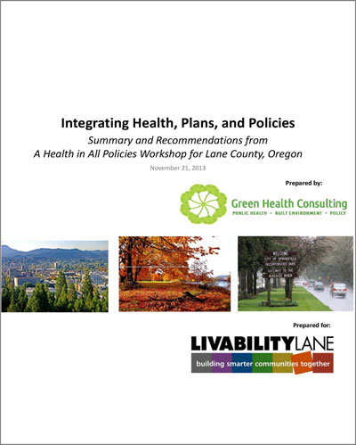 The Lane County Public Health Division (PHD) and the Lane Livability Consortium (LLC) cosponsored a health in all policies (HiAP) workshop for public health and planning professionals, policymakers, and non-profit professionals from a wide range of sectors on November 21, 2013. Green Health Consulting created the workshop content and structure and facilitated the half-day session. Health in All Policies is a collaborative approach that integrates health considerations into policy making across sectors such as housing, land use, transportation, and economic development. The workshop's goal was to build capacity among LLC members and other Lane County organizations to integrate health into plans and policies in diverse sectors, and to apply practical solutions that result in healthy communities. The workshop objectives were: